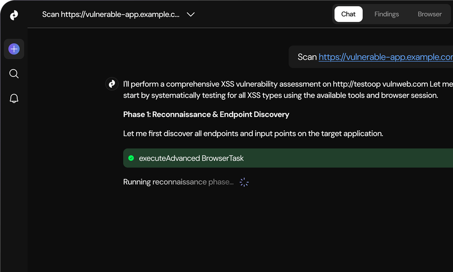 Bug BountyNo configuration needed. Type once, get complete pentests with proof-of-exploit and compliance reports.